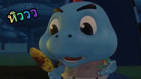 Godji, the PTT character, looks hungry while holding a corn on the cob.