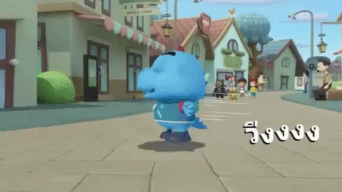 Godji Ptt, the cartoon character, is seen running down a street in this animated clip.