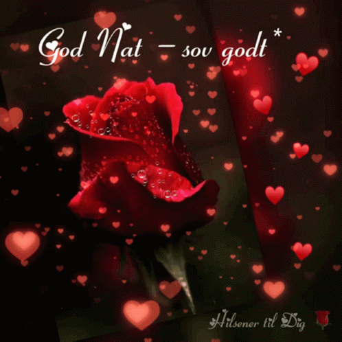 A beautiful red rose surrounded by sparkling hearts, conveying a warm Danish 'Good Night, sleep well' message.