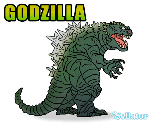 A vibrant cartoon drawing of the iconic monster Godzilla, featuring its classic spiky back and fierce expression, created by artist Sellator.