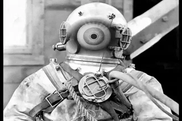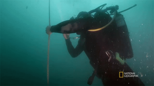 Albert Lin, a scuba diver, ascends a rope underwater in murky green water, featured by National Geographic.