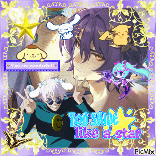 A vibrant collage featuring Gojo Satoru, Pikachu, Cinnamoroll, and other anime characters with positive messages.