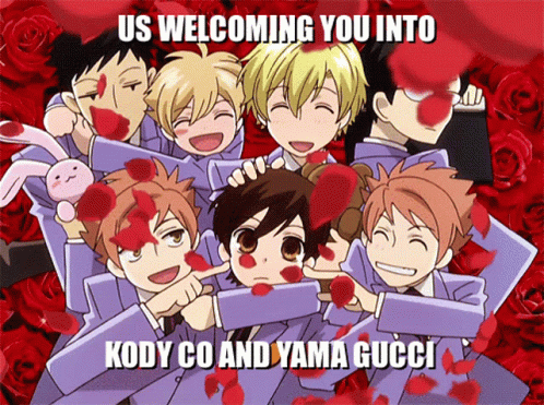 Ouran High School Host Club characters welcome Kody Co and Yama Gucci, surrounded by falling red rose petals.