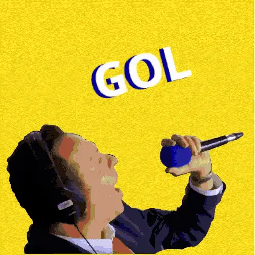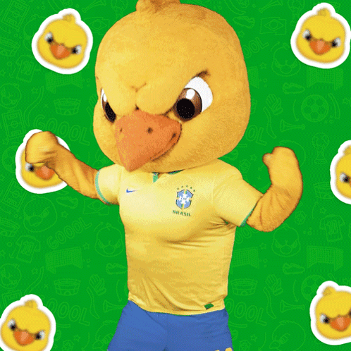 Canarinho, the official Brazil football mascot, celebrates a goal with an energetic dance and 'GOOOOOOL!' text.