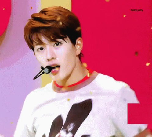 Golden Child's Bomin winks and makes an 'okay' gesture during a performance, looking charming.
