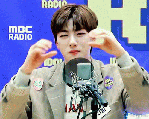Golcha Jibeom making cute heart gestures, including a finger heart, during an MBC Radio appearance.