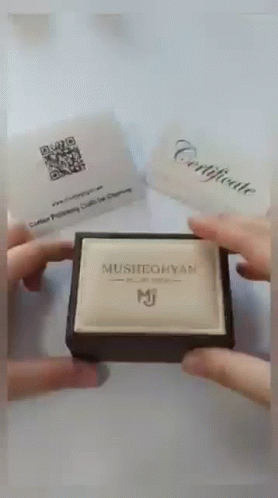 Unboxing a Musheghyan gold ring, revealing the elegant jewelry inside its branded box with a certificate.