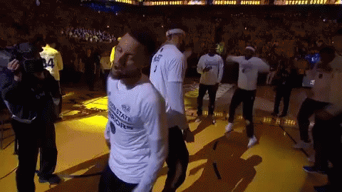 Golden State Warriors players celebrate on the court after an NBA game, surrounded by confetti.