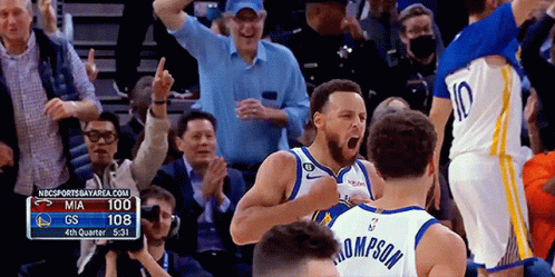 Stephen Curry of the Golden State Warriors celebrates intensely during a basketball game, pumping his chest and yelling.