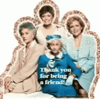 The Golden Girls cast, including Betty White, with the iconic phrase 'thank you for being a friend'.