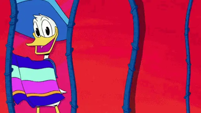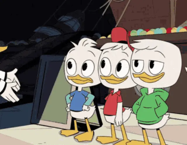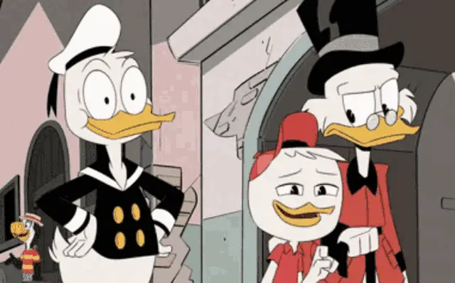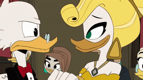 Goldie O'Gilt shushing Scrooge McDuck, who looks angry, in a scene from Ducktales.