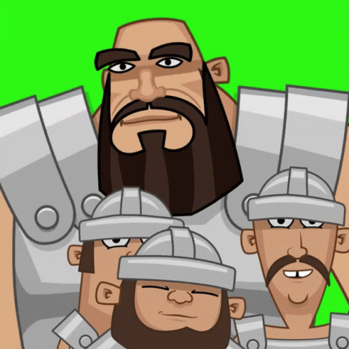 Goliath and his armored companions celebrate joyfully in this funny cartoon. They are dancing and having a party.