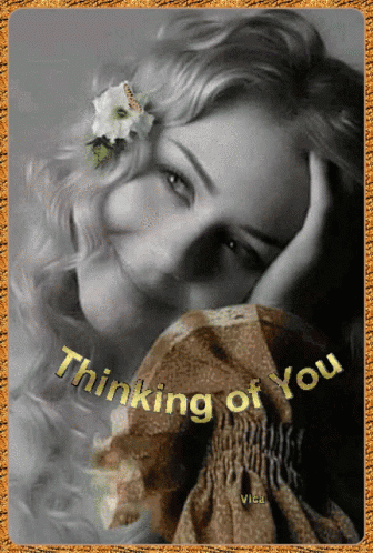 A pretty girl with a flower and butterfly in her hair, smiling and daydreaming, with the text 'Thinking of You'.