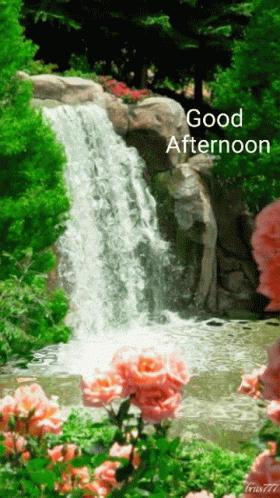 Beautiful waterfall and pink flowers with a 'Good Afternoon' message.