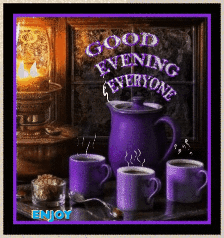 A warm 'Good Evening Everyone' greeting card featuring purple cups, a teapot, and a glowing lantern.