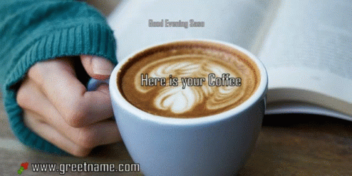 Good evening Saso! A person holds a warm cup of coffee with a latte art design, ready to enjoy.