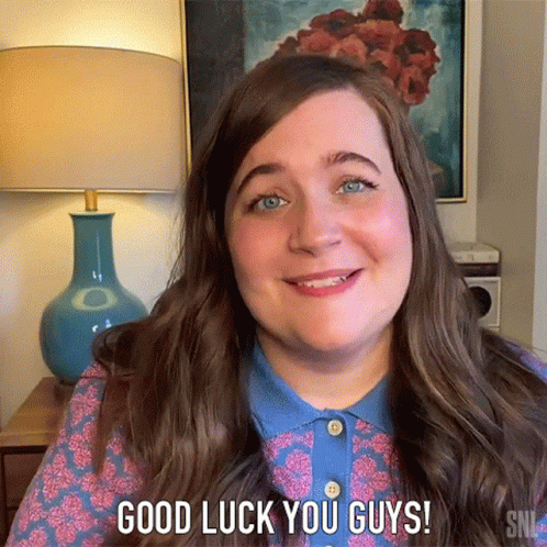Aidy Bryant smiles and waves, wishing "Good Luck You Guys!" in a warm, encouraging message.