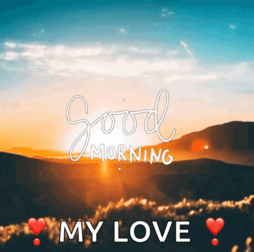 A beautiful sunrise over mountains with a heartfelt 'Good Morning My Love' message, perfect for sharing.