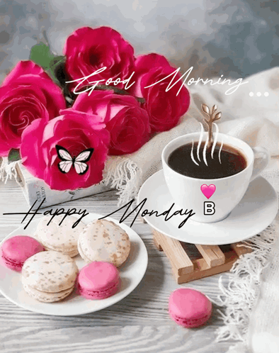 A delightful 'Good Morning, Happy Monday' scene with coffee, macarons, and pink roses.