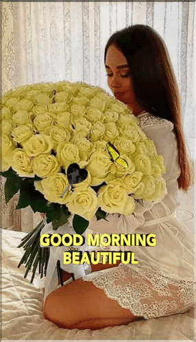 A woman holding a large bouquet of yellow roses, accompanied by a "Good Morning Beautiful" message.
