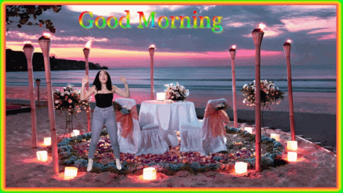 A woman dances energetically on a beach at sunrise/sunset, surrounded by a romantic setup, with 'Good Morning' text and changing sky colors.