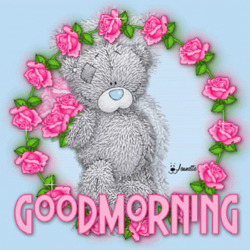A cute grey teddy bear is surrounded by a wreath of pink roses, with 'GOOD MORNING' in glittery pink letters.
