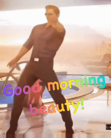 Johnny Cage strikes a dynamic pose with 'Good morning beauty!' text, delivering a vibrant and energetic greeting.