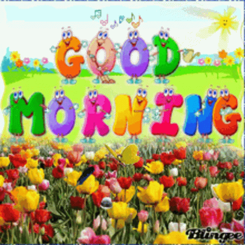 An animated "Good Morning" card featuring colorful letters, musical notes, and a vibrant field of tulips with butterflies.