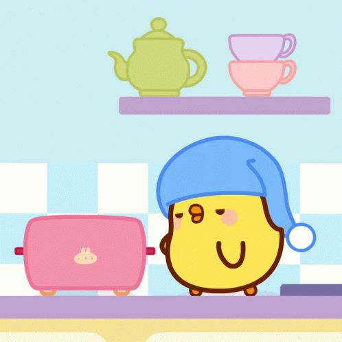 A sleepy cartoon chick in a blue cap prepares breakfast, watching toast pop from a pink toaster.