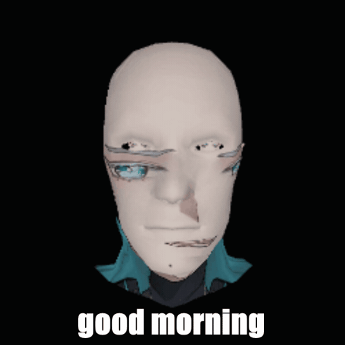 A stylized character with a large forehead and blue scarf, with the text "good morning" displayed.