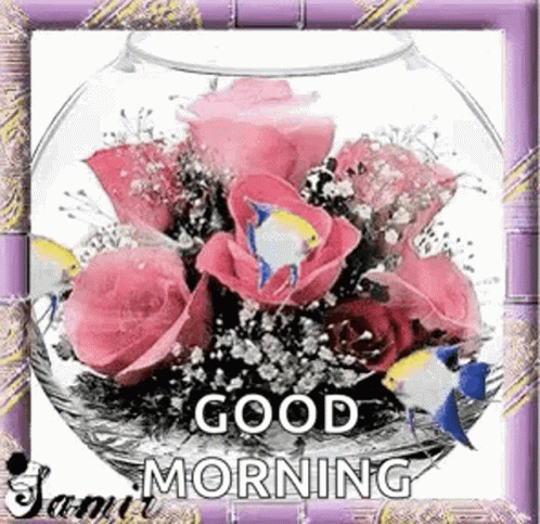Animated good morning greeting with pink roses and swimming fish in a clear glass bowl.