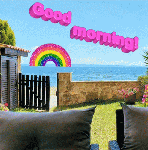 Bright and cheerful good morning scene featuring a beach, ocean, and a vibrant rainbow.