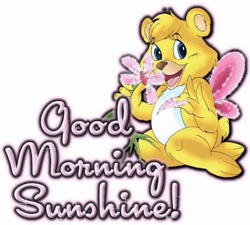 A cute teddy bear with pink wings holds a sparkling flower, wishing a good morning.