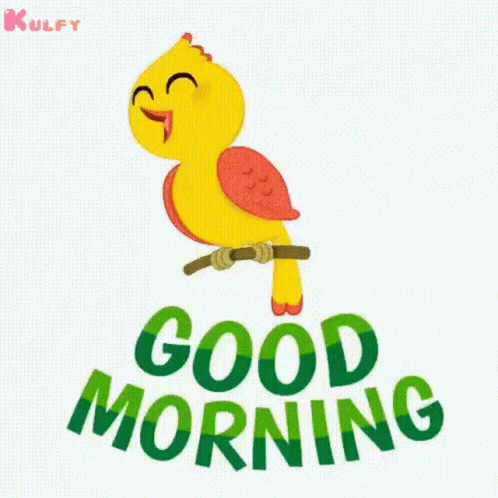 A cheerful yellow parrot perched on a branch with a 'Good Morning' greeting.