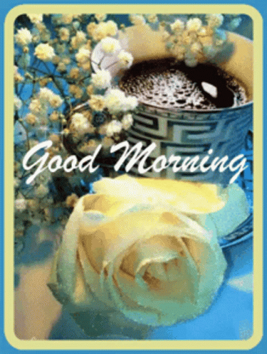 A beautiful good morning card featuring a cup of coffee and a white rose.