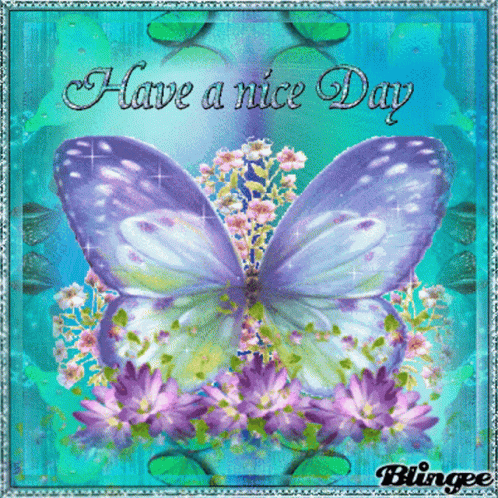 Glittering butterfly and flowers with a 'Good Morning Have A Nice Day' message, set in a decorative frame.