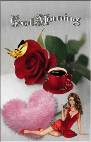 A vibrant Good Morning greeting featuring a woman in a red dress, a red rose with a butterfly, and a cup of coffee.