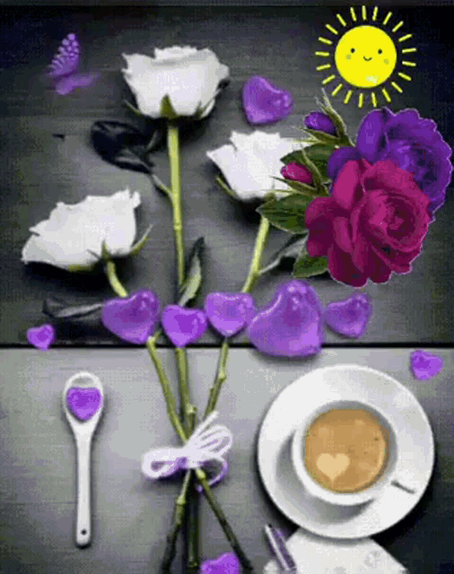 Laurasthings shares a beautiful good morning scene with white and purple roses, hearts, and a cup of coffee.