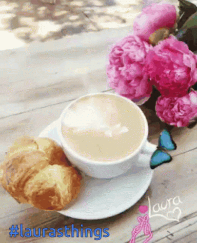 Laurasthings shares a cozy good morning with coffee, croissant, and pink peonies.