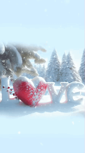 A beautiful snowy winter scene with 'LOVE' spelled in snow, featuring a red heart and a 'Good morning!' message.