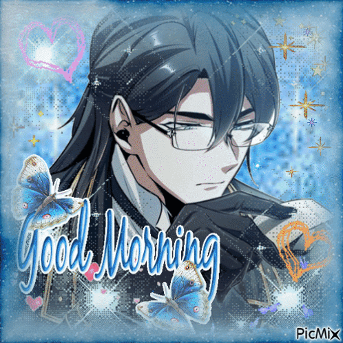 Good Morning message featuring anime character Ludger Cherish with glasses and butterflies.