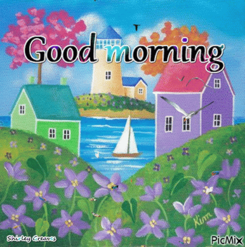 A vibrant animated painting depicting a serene coastal scene with colorful houses, a lighthouse, sailboat, and flowers, wishing 'Good morning'.