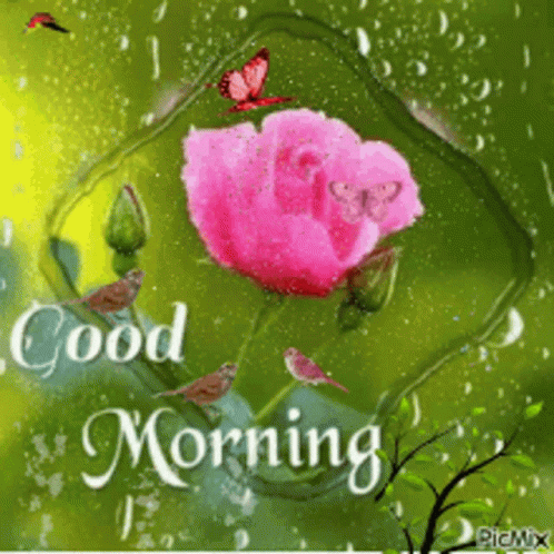 Animated good morning card featuring a vibrant pink rose, cheerful birds, and fluttering butterflies.