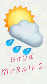 Animated 'Good Morning' message with sun, cloud, and raindrops.
