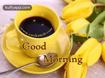 A yellow coffee cup with a spoon on a saucer, featuring a 'Good Morning' message.