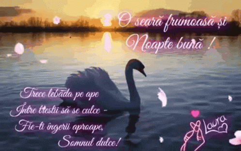 A serene good night message featuring a white swan on a lake at sunset, with Romanian text and floating petals.
