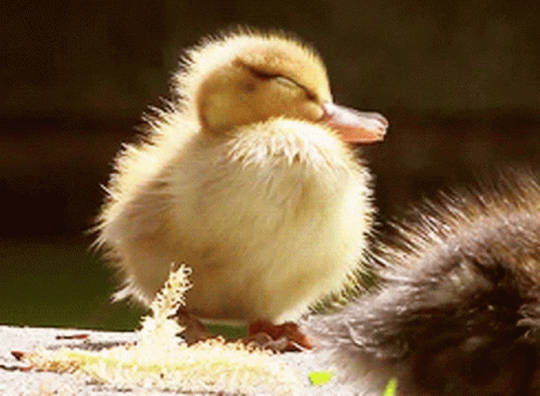 A fluffy yellow duckling stands on a rough surface, yawning widely before closing its eyes, ready for sleep.