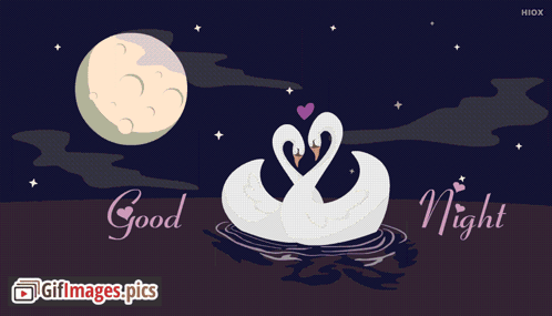 Two elegant swans form a heart with their necks under a full moon, wishing 'Good Night' and 'Sweet Dreams'.