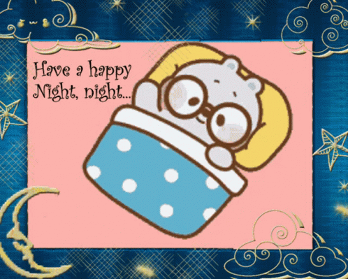Animated card featuring a cute cartoon character in bed, wishing 'Good Night Sweet Dreams'.