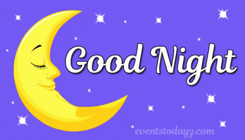 A charming cartoon illustration of a sleeping crescent moon with stars and the words 'Good Night'.